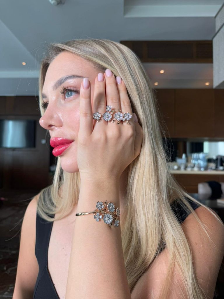 Ce modèle unique présente une double bague en or ornée d'un motif floral délicat et rehaussée de diamants étincelants. Un bijou d'exception, conçu pour celles qui apprécient l'originalité et le luxe.
